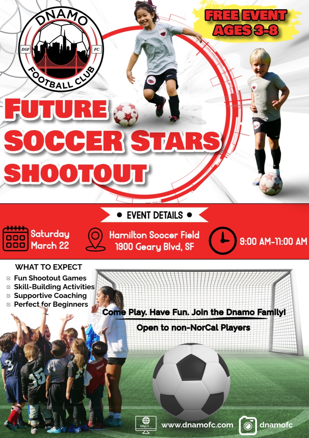 At Dnamo FC, we believe a child’s first experience with soccer should be joyful, confidence-building, and full of energy. Our Future Soccer Stars Shootout is a free open-play event designed specifically for young players who are new to club soccer and ready to have fun.